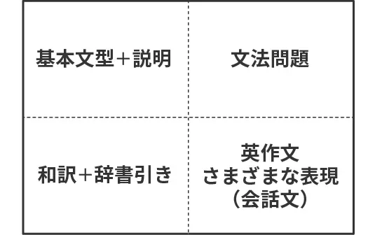 この4つの領域を見ていただくと、「ステップアップ講座」は文法を体系的に理解・習熟することに重きを置いていることがお分かりいただけると思います。
