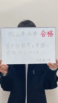 県立高校一般入試の合格が発表され中央通り校にも うれしい報告がたくさんきております。 県立 松山東高校  松山南高校 4名 松山工業   私立 新田高校 4名 済美高校 5名 松山聖稜高校 指導者や生徒との頑張りが結果に結びついて嬉しいです。 3月から高校に向けた準備をしていますが 生徒から「高校の数学面白い!!」 との声が上がっていました。 この後は合格者招集、入学式とあるので そろそろ勉強の準備も始めていきませんか??